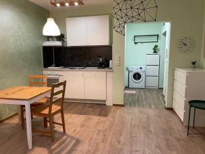 The apartment includes a living room equipped with a flat-screen TV and a work desk. The kitchenette contains an oven, fridge, stovetop, and tea/coffee maker. The bathroom is private and fitted with a hairdryer, shampoo, soap, towels, and linens. Heating is available in the sleeping area for added comfort.