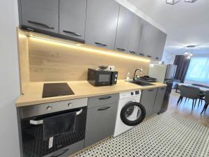 Просторное помещение включает одну спальню, гостиную, полностью оборудованную кухню и ванную комнату с стиральной машиной. Для развлечений предусмотрён телевизор с плоским экраном. Обеспечен комфортный бездымный режим пребывания.