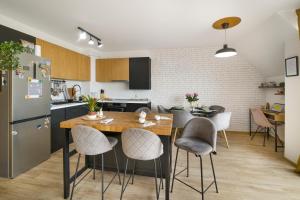 В апартаментах предусмотрена система кондиционирования воздуха во всех помещениях, а также полностью оборудованная кухня со стеклокерамической плитой, духовкой, посудомоечной машиной, холодильником, тостером, кофемашиной и стиральной машиной. В гостиной установлен телевизор с плоским экраном и доступом к стриминговым платформам. В ванной комнате имеются как ванна, так и душ, гостям предоставляются бесплатные туалетные принадлежности. На открытой террасе обустроена обеденная зона с видом на город и реку.
